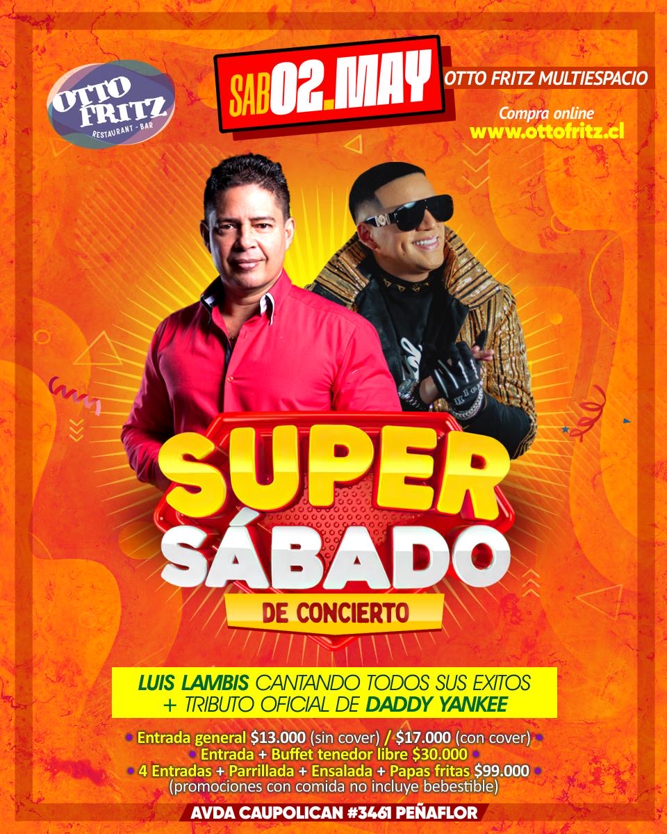 Se viene… Super Sábado de Concierto con Luis Lambis y Todos sus éxitos y Tributo Oficial de Daddy Yankee en Vivo!!… Buffet tenedor libre, cerveza de barril, tragos internacionales, chorrillanas y mucho más..